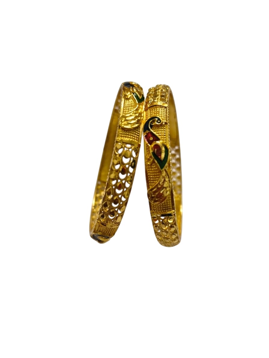 These are traditional Indian-style gold bangles featuring an intricate Peacock (Mayur) motif. The design combines several classic jewelry-making techniques: