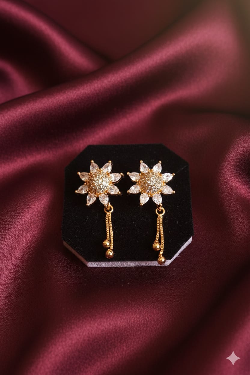 Elegant gold-tone drop earrings featuring a sparkling oval CZ top with delicate bell-shaped danglers, adding graceful movement and festive charm to ethnic and party wear looks.