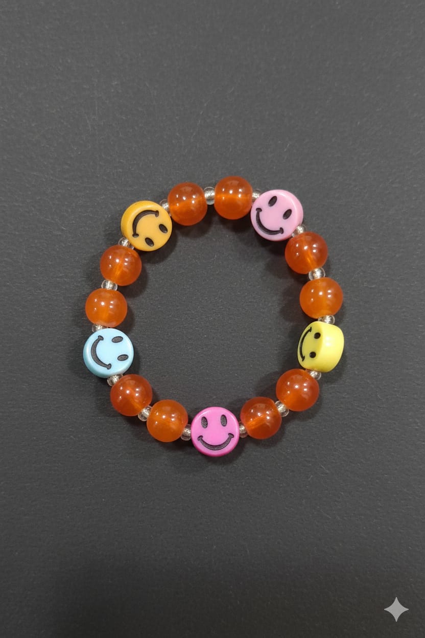 A cheerful elastic bracelet featuring glossy white beads accented with colorful smiley-face charms, perfect for adding a fun and playful touch to everyday outfits.