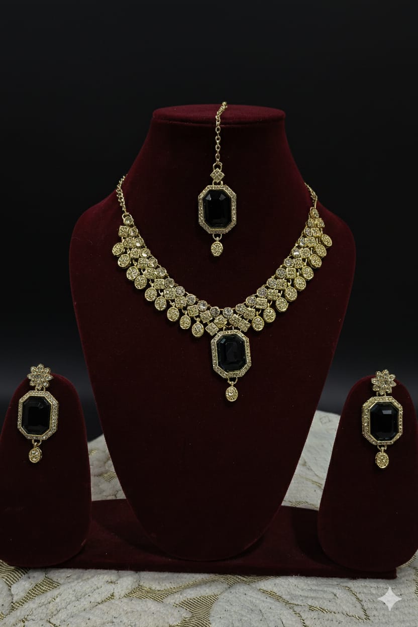 A striking Kundan-style necklace set highlighted with bold black onyx stones, complemented by matching earrings and maang tikka—perfect for elegant evening wear, weddings, and statement ethnic looks.