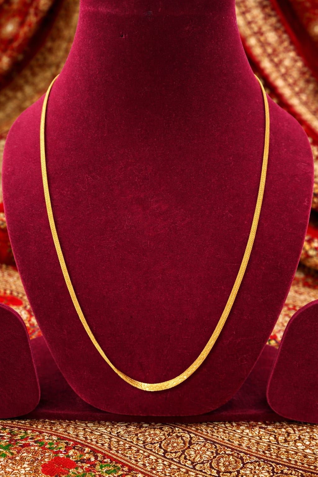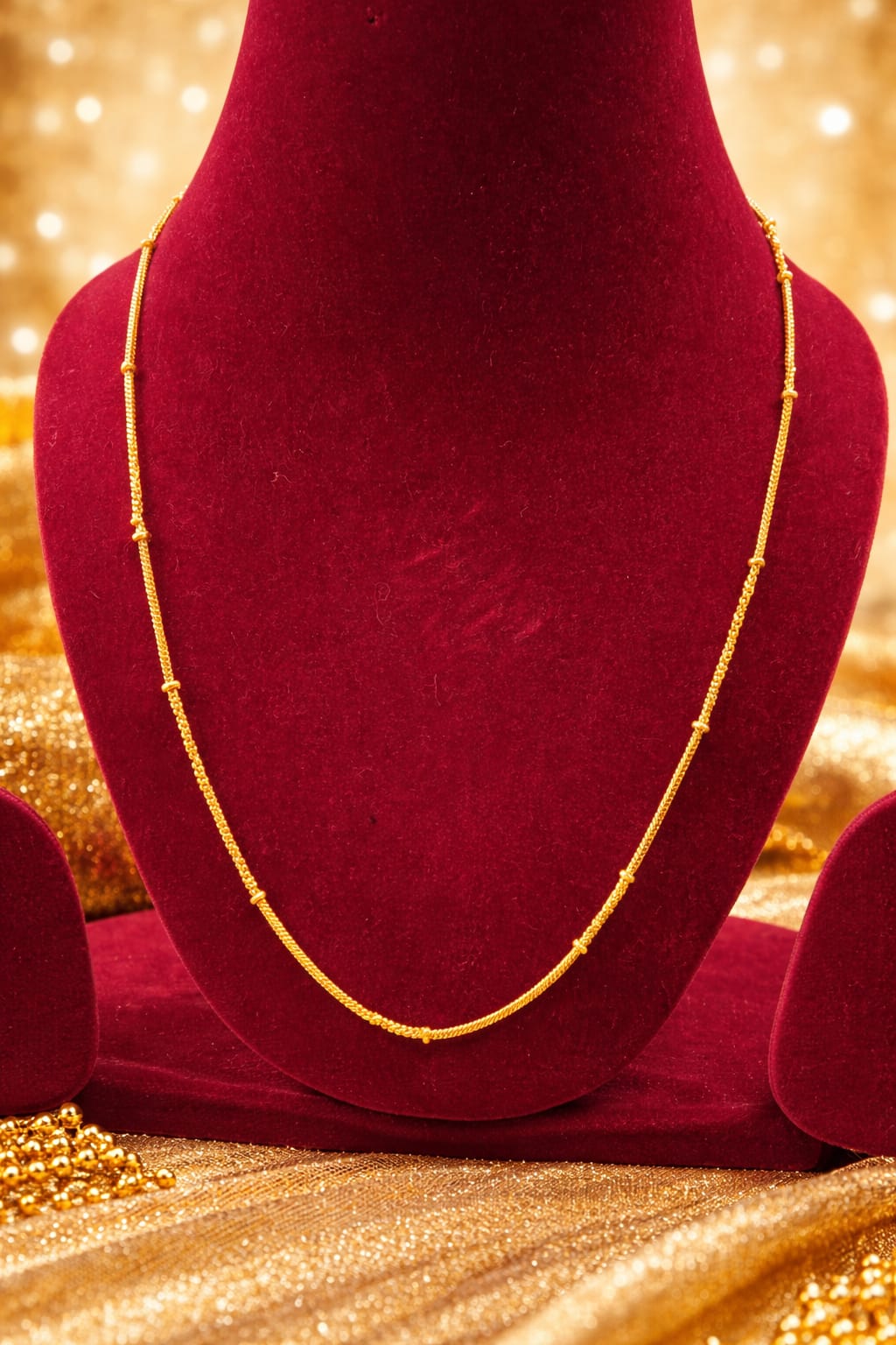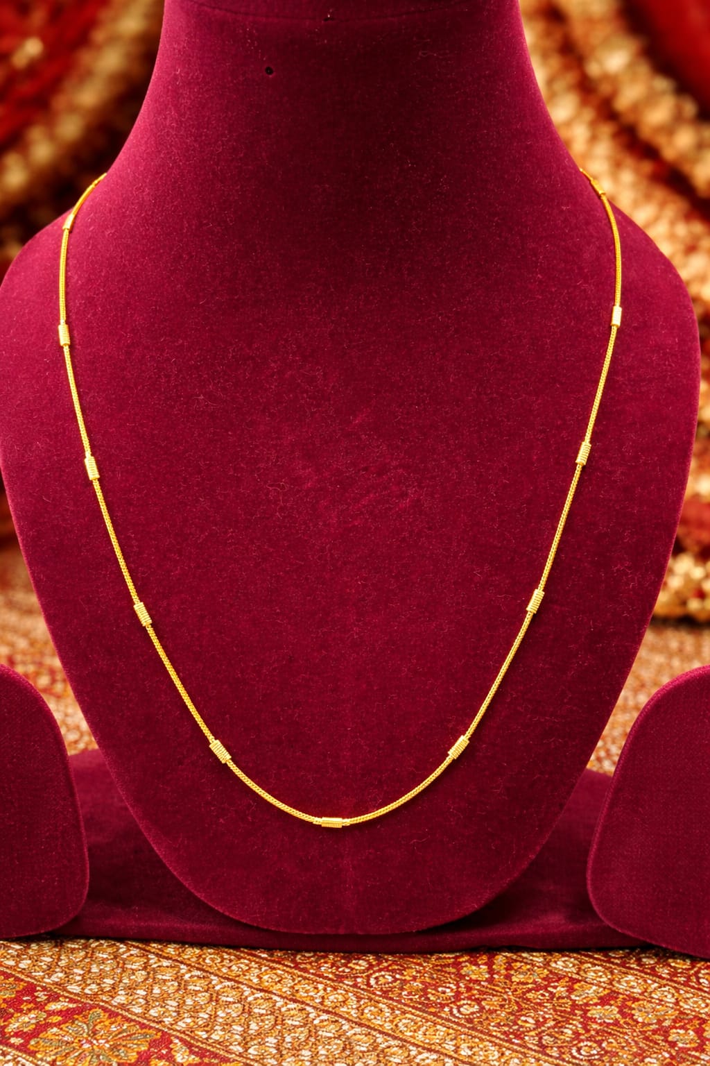 The necklace features a delicate, high-polish gold chain (likely a snake or tight cable link) punctuated by small, cylindrical barrel beads. These beads have a textured, ribbed finish that adds a subtle play of light against the smooth surface of the chain. Its lightweight and elegant design makes it ideal for: