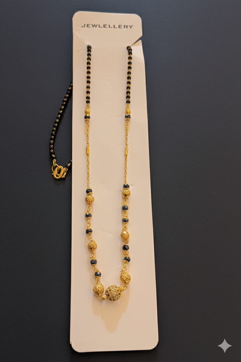 A Mangalsutra featuring a gold-toned chain with black beads, which is traditional Indian bridal jewellery. The design includes alternating sections of small black beads, golden tubular beads, and larger, ornate golden beads, culminating in a decorative, diamond-cut or studded golden center pendant/bead cluster.