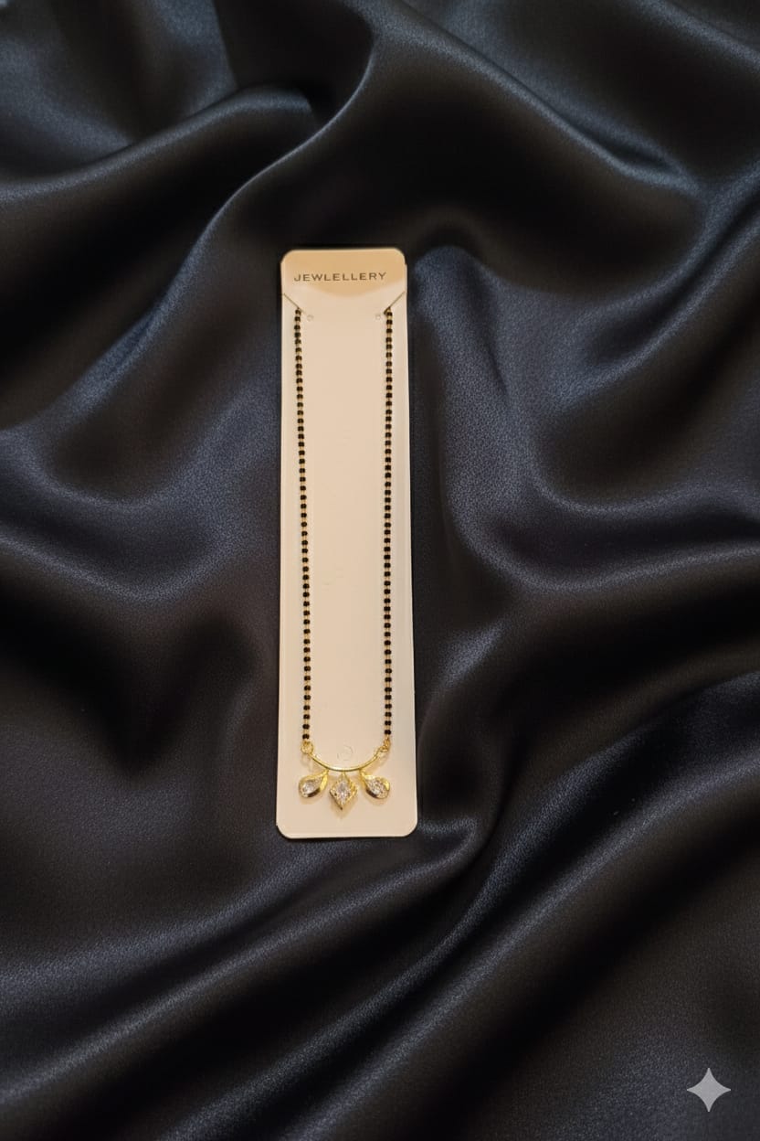 A delicate black-bead mangalsutra featuring a gold-toned pendant with three shimmering teardrop stones. Set on a smooth satin background, this design blends simplicity and sparkle—perfect for daily wear or special occasions.