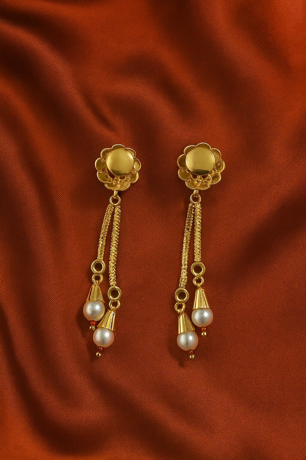 These earrings showcase a luxurious floral design with a gold-toned base. The stud features a flower-shaped motif, encrusted with sparkling white stones and centered with vivid ruby-red stones. Dangling from the studs are dual golden chains, each accented with small ruby embellishments and finished with elegant round pearls set in cone-shaped gold caps. The combination of rubies, pearls, and shimmering stones creates a regal and traditional look, making them perfect for festive or bridal wear.