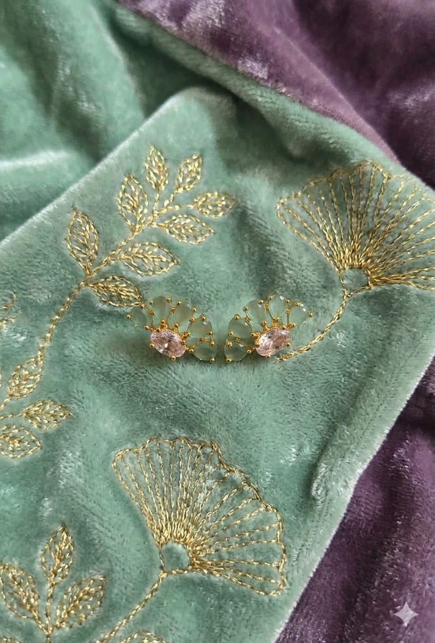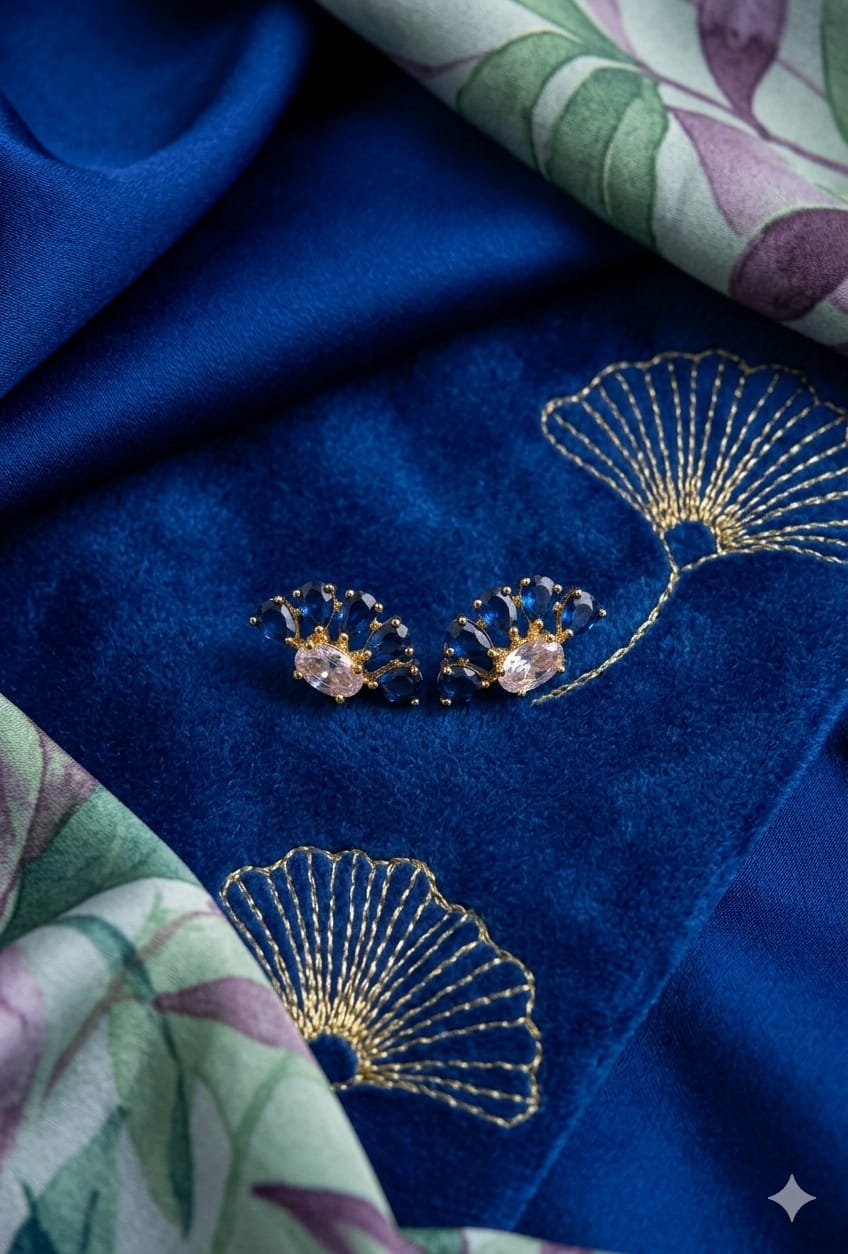 Stunning sapphire-blue petal stones arranged in a graceful fan design with a sparkling crystal centerpiece. These gold-tone stud earrings offer a perfect blend of elegance and charm, making them ideal for parties, festive occasions, or everyday glam. ✨💙