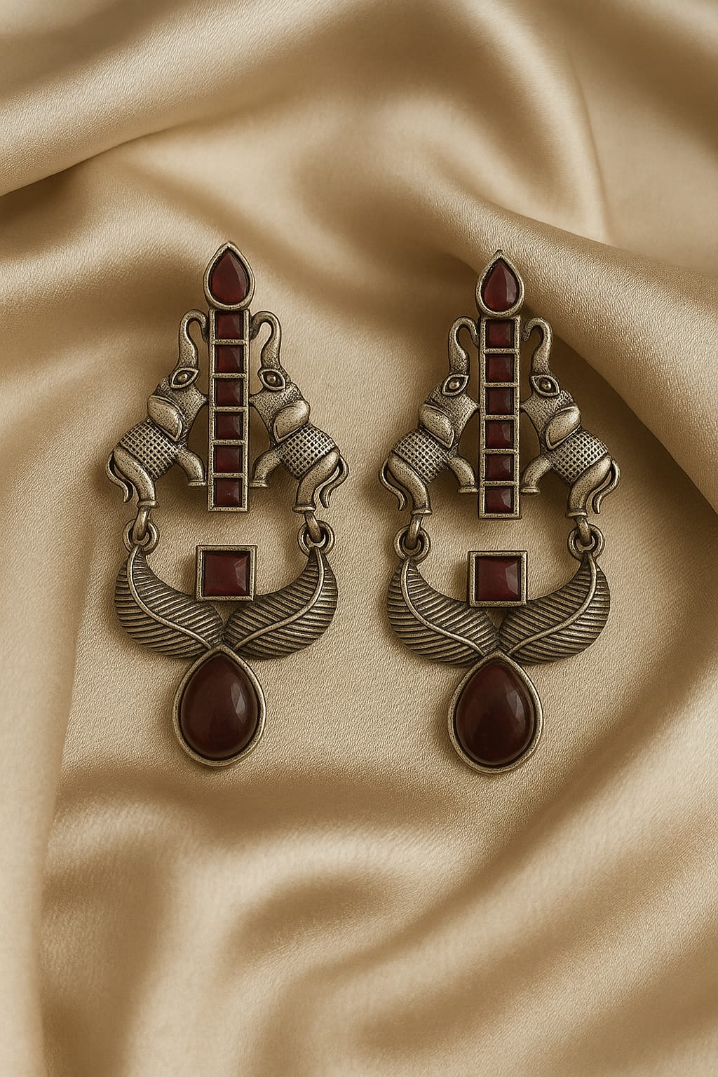 These vintage-inspired earrings showcase a graceful leaf design with intricate filigree detailing and oxidized metallic finish. The swirling patterns and embedded dark-toned stones give them a regal, handcrafted look reminiscent of traditional Indian artistry. Perfect for ethnic outfits or fusion wear, these earrings exude old-world charm and timeless sophistication.