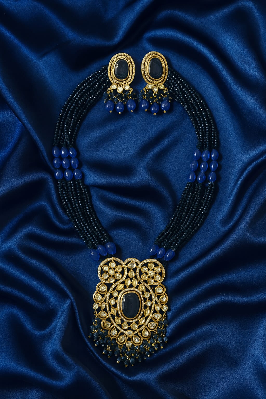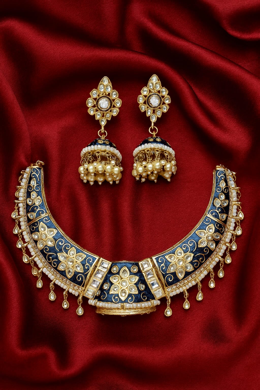 Necklace: A wide choker-style necklace designed with intricate floral motifs in golden Kundan stones, enhanced with navy blue meenakari enamel work. The edges are adorned with white pearls and dangling tear-drop beads, giving it a regal look.