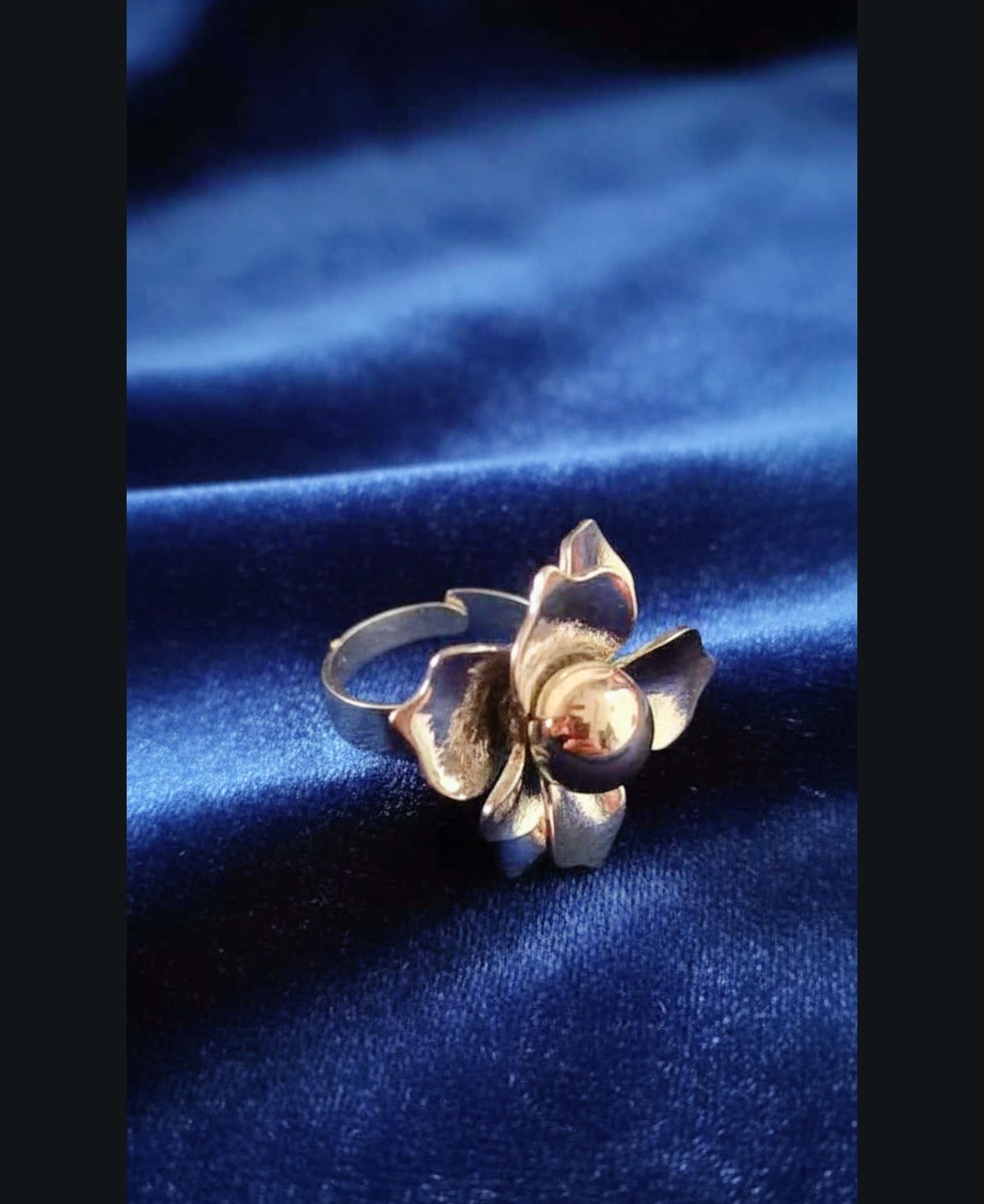 This is a silver-toned or platinum-plated ring featuring a large, ornate flower design as its centerpiece. It is a type of cocktail ring or statement ring, typically worn for fashion, and the flower has multiple polished petals and a textured or slightly raised center.